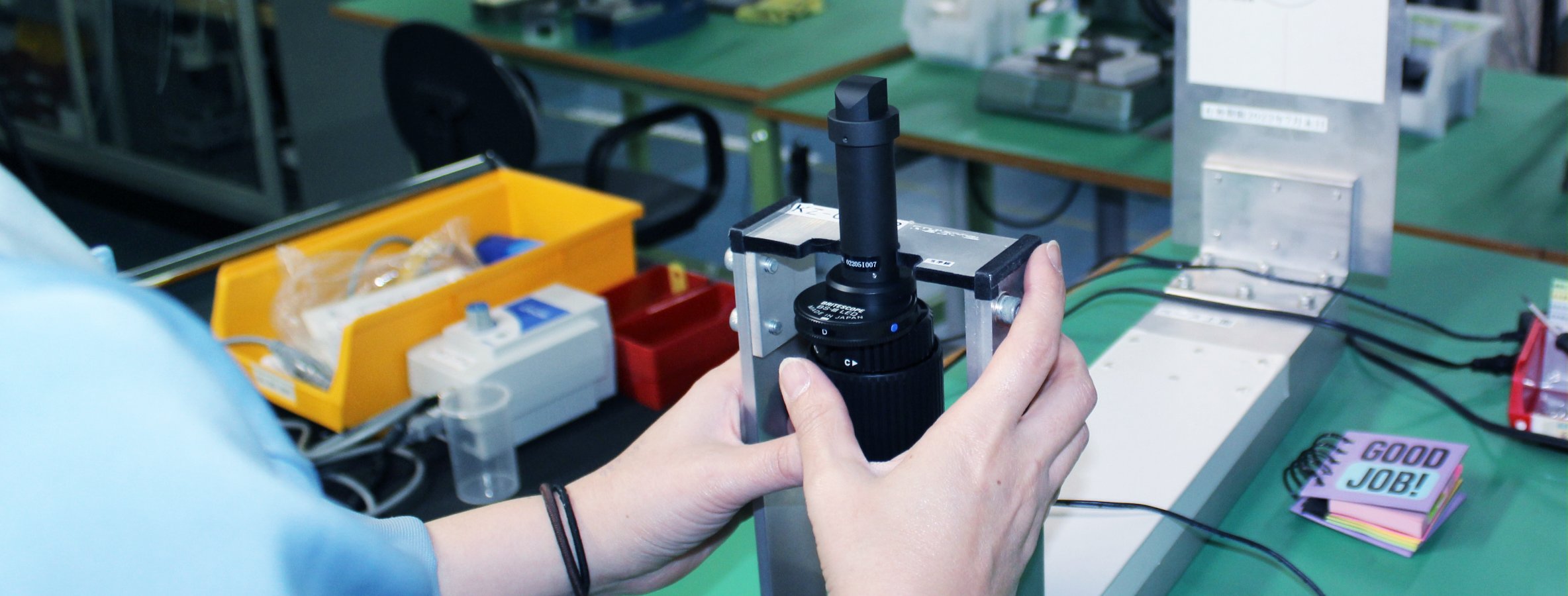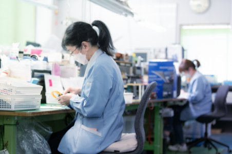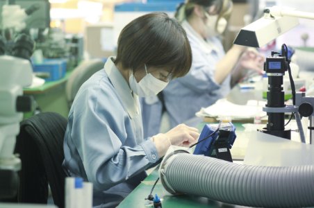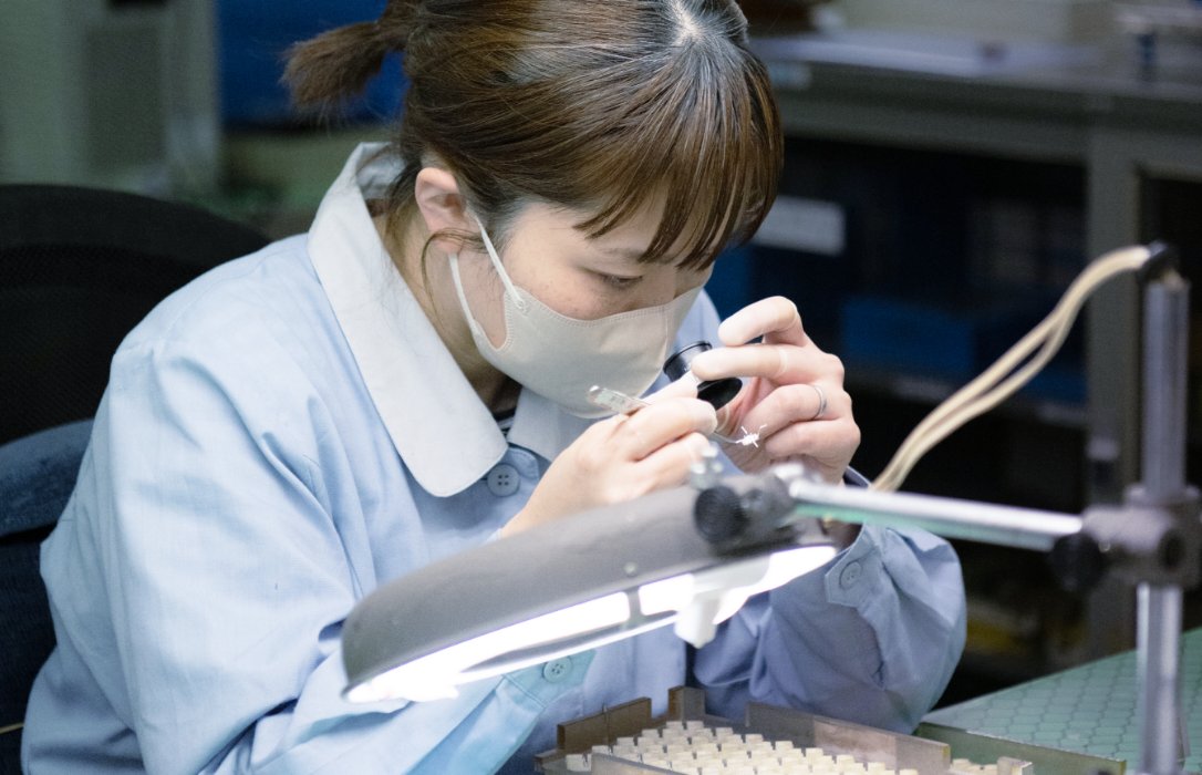 当社の医療機器は眼科医で使われる倒像鏡等をメインに製造しております。レンズやLED等の光学部品を使用しており、製品一つ一つ手作業での組立製造を行っております。