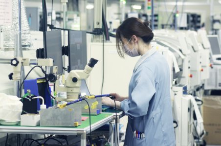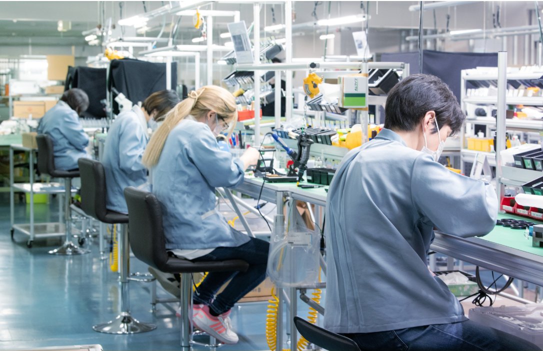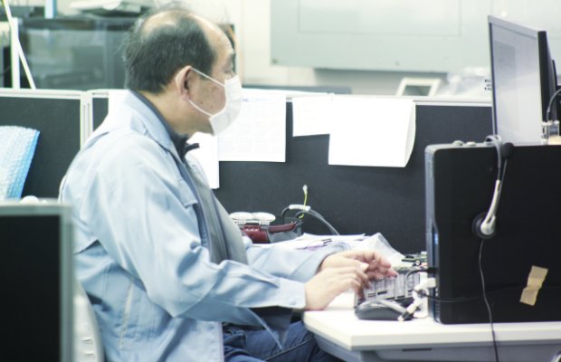 製造部は製造1課・製造2課・基板実装課・サービス課と4部署に分かれており、各課年間の数値目標を目指し、業務を行っています。当社の特徴のひとつとして、全体の60%が女性社員です。